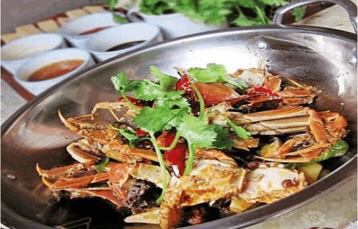 8)在爆香葱姜蒜。9)倒入螃蟹翻炒。10)加入白酒炒香。11)加入糖。12)加入醋翻炒均匀。13)加入生抽翻炒均匀。14)加入一勺高汤烧至片刻。15)加入适量的盐。16)翻炒均匀关火 17)撒上香菜盛入火锅中,随酒精炉和蘸料一起上 18)把螃蟹吃完后加入适量的高汤,放入喜欢的材料继续煮至即好。