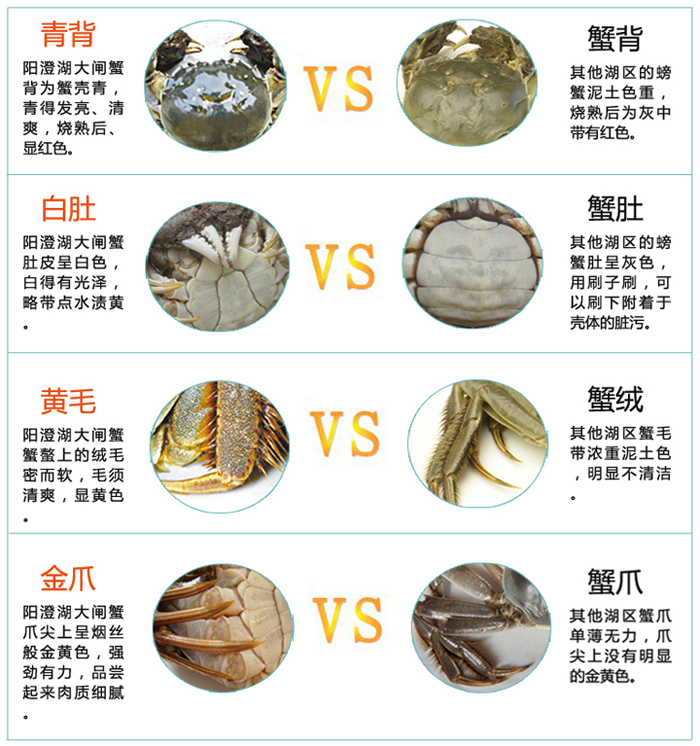 第一、阳澄湖大闸蟹有五个特点:青背(蟹壳呈泥青色/青灰色),白肚(贴泥的肚脐白中带青,没有黑色斑点),黄毛(蟹腿上的毛呈黄色,挺拔柔软),金爪(蟹爪上有丝丝缕缕的金黄色),体壮(个头结实,膏黄饱满,掂起来沉甸甸的)。购买的时候要注意这五点。