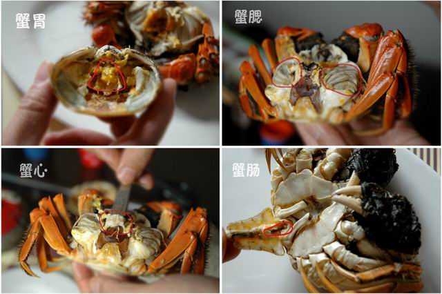 第二步将蟹掩(即蟹肚脐部分的一小块盖,公蟹母蟹形状不同)去掉,顺势揭开蟹盖;吃的时候、先吃蟹盖部分,用小勺把中间的蟹胃部分舀出,轻轻将外面包裹着的蟹黄吮干净。注意,不要吮破中间那个呈三角锥形的蟹胃,应将其丢弃吃完蟹盖轮到蟹身,先用剪刀将多余的蟹脚、蟹嘴和蟹肺剪掉用勺柄将蟹身中间一个呈六角形的片状物挑出来,那是蟹心部分,丢弃;用小勺舀点醋淋在蟹身上,然后把蟹身的蟹黄蟹膏吃干净把蟹身掰成两半,此时可见成丝状的蟹肉。只要顺着蟹脚来撕,就可以将蟹肉拆出。吃干净的蟹壳是完整呈半透明状的;用剪刀把蟹腿剪成三截,最末一节蟹脚尖可充当工具。先用蟹脚尖细的那一头把蟹腿中段的肉捅出来,再用蟹脚尖粗的那一头把蟹腿前段的肉捅出来;将蟹钳分成三段,前两段都可将蟹壳直接剪开,用勺舀出肉。最后的那只钳子,技巧是剪开两边,然后用手往相反的方向掰两只钳脚,钳壳就完整地分开了;以此吃法吃出来的蟹壳,虽未必能完整地拼回一只蟹的形状来,却也铺陈得条理分明,丝肉不剩。吃完蟹壳洗一洗手,再喝上一杯暖融融的姜茶,一顿饭的时间就吃一只大闸蟹,也觉得酒足饭饱了。