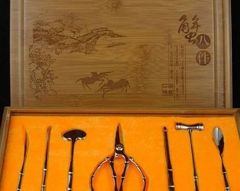 早在明代,江南的能工巧匠就发明了吃蟹的工具,包括锤、镦、钳、铲、匙、叉、刮、针,称之为“蟹八件”。后来甚至发展到十二件。也有从实用价值出发,简化成六件或四件的。多是铜铸的,镏金或镀银,造型美观,精巧玲珑。这些食蟹工具,工艺上十分考究,比如刮具有点像宝剑,匙具像是文房中的水盂,针也有扁头和圆头的区分。